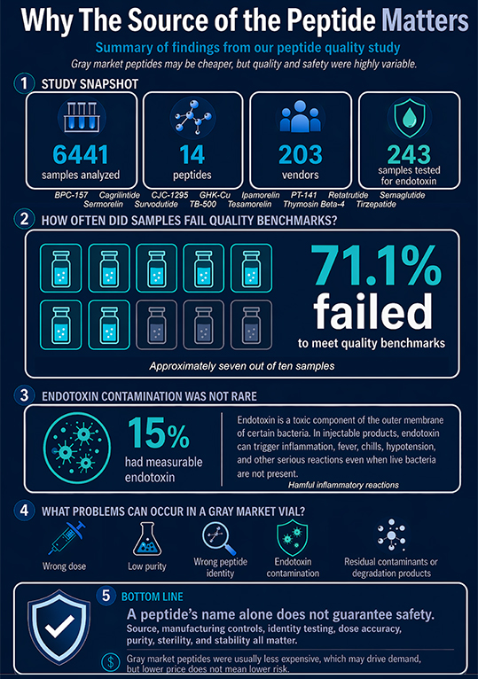 There is an emerging “gray market” of peptides which are not subject to regulatory oversight. Approved peptide drugs are made under highly controlled conditions with strict purification, identity testing, batch validation, and contamination monitoring. Gray market peptides are often produced outside those systems. That means the vial may contain the wrong dose, the wrong peptide, breakdown products, residual solvents from synthesis, bacterial contamination, endotoxin contamination, heavy metals, or other impurities that would normally be detected and removed in regulated manufacturing. Even a vial labeled “99 percent pure” may still contain clinically important impurities if the manufacturing and validation process is poor.